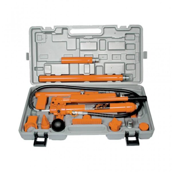 Equipo hidráulico para trabajos de expansión, presión, enderezado, flexión. Set de 15 piezas y accesorios para los distintos tipos de usos. Maletín plástico con ruedas para traslado.